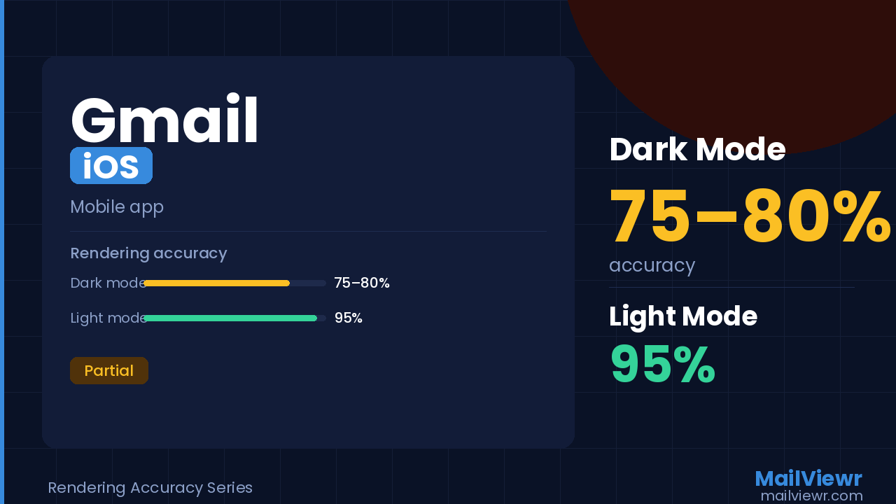 Outlook iOS color override logic is undocumented. This is the most complex client to simulate. Structural accuracy is high; color accuracy is actively being improved.