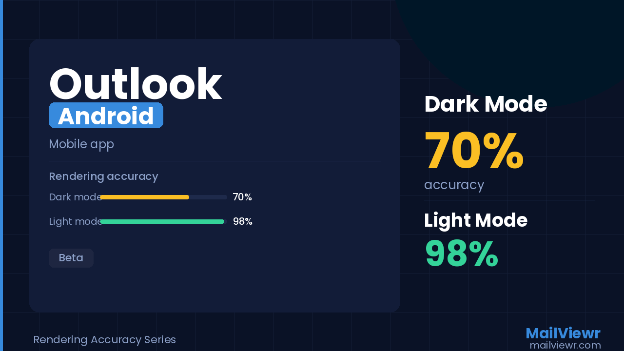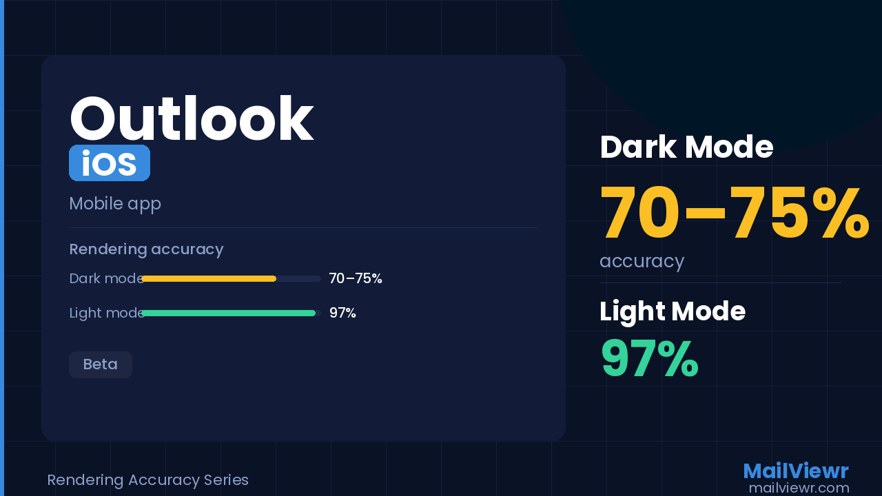 Outlook mobile dark mode uses undocumented colour override logic. Desktop and light mode accuracy is verified against real device recordings. Beta figures are estimates based on partial validation.
